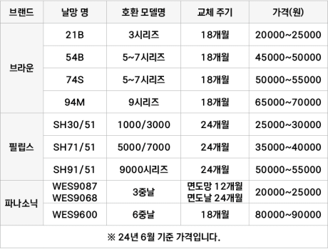 - 파나소닉: 면도망 12개월/면도날 24개월 각각 교체 (분리형 모델)